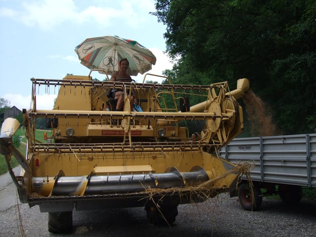 Das Getreide wird mit einem eigenen Mähdrescher gedroschen . Auch das Stroh wird selber zu Kleinballen gepresst . Das Futtergetreide wird den Kühen verfüttert und auch teilweise verkauft .